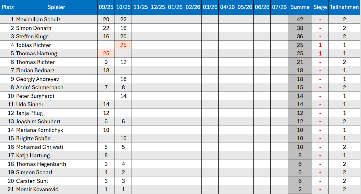 Thomas Richter brachte Georgiy Andreyev aus Zeitz mit. Er debütierte schon am Ende der letzten Serie, bringt frischen Wind ins Turnier und landete knapp vor seinem Mannschaftskameraden in der Jugendbundesliga, Simon Donath, auf Rang 4.