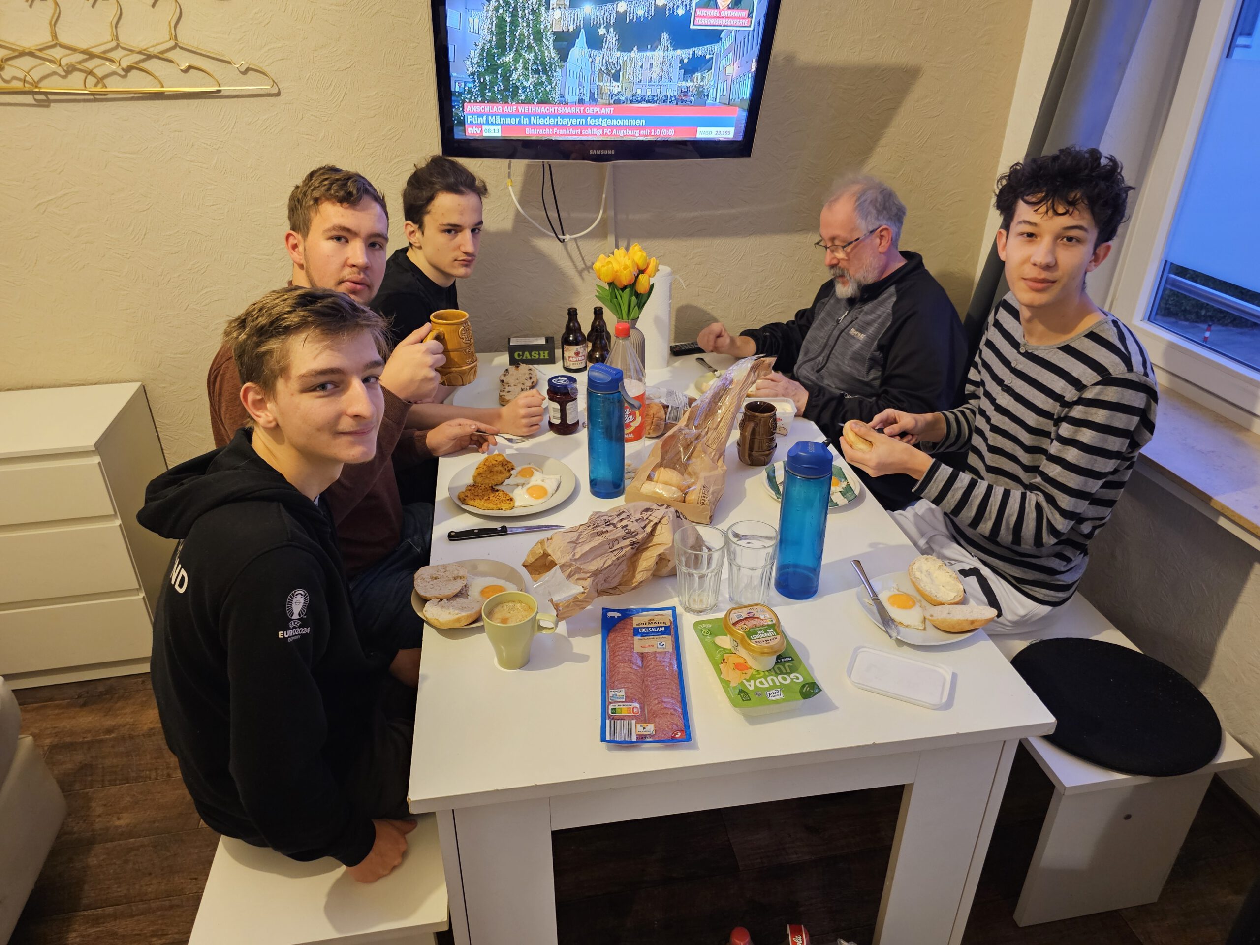 In der Ferienwohnung angekommen wurde sogleich ein Schachbrett installiert und kurze Zeit später eingekauft. Unsere beiden Ältesten begaben sich dann zum Weihnachtsmarkt, während die restlichen vier den Abend in der Unterkunft ausklingen ließen. Am Morgen sorgte Chefkoch Matthias für Spiegeleier und einen rundum gelungenen Start in den Tag. Danach gingen wir zum Spiellokal, welches leider nicht mehr, wie noch vor ein paar Jahren, das Weserstadion war.