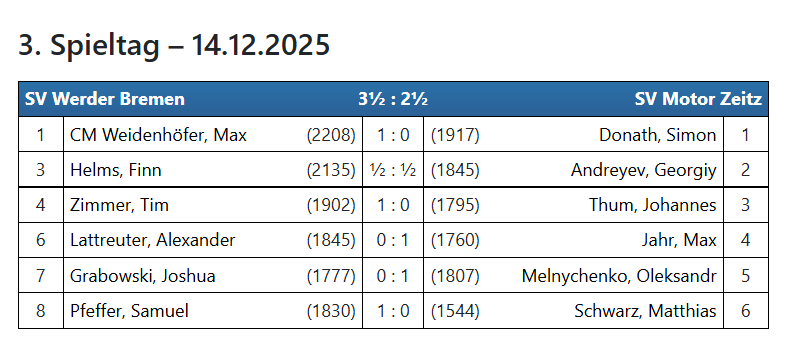 Insgesamt kann man mit dem Ergebnis zufrieden sein. Es wäre zwar, wie bei fast jedem Mannschaftskampf, in einzelnen Partien mehr drin gewesen, aber das trifft ja auf die Gegner ebenso zu. Wir haben uns als Underdogs im fast 400 Kilometer entfernten Bremen auf jeden Fall gut verkauft. Unter diesem Gesichtspunkt sind noch einmal besonders Thomas Richter und Matthias als Fahrer zu erwähnen, welche uns sicher nach Bremen und zurück brachten. Ersterer war ebenfalls wie immer ein toller moralischer und schachlicher Beistand. Ich möchte an dieser Stelle auch den Organisatoren des SV Werder Bremen danken, die kostenlose Getränke für Spieler und Betreuer stellten!