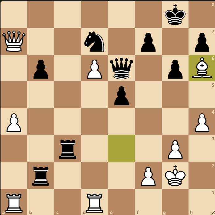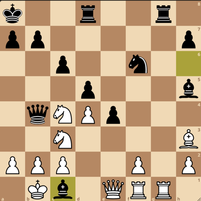 Ich fand hier zwar die richtige Idee, spielte sie aber aus einem mir selbst im Nachhinein nicht begreiflichen Grund erst im 27. Zug. Kurze Zeit später vertat ich mich nochmal im Endspiel und musste die Niederlage hinnehmen.