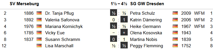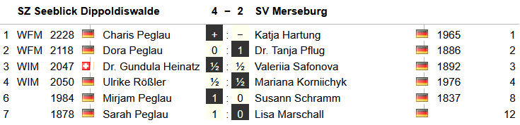 Somit erspielte sich Merseburg zwar keinen Mannschaftspunkt, aber zu fünft immerhin ein 2:4 gegen nominell ausschließlich höher gewertete Gegnerinnen!