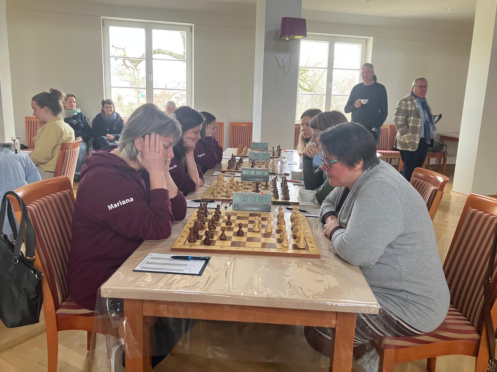 Aufällig war zunächst der frühe materielle Nachteil auf Brett 6. Hier hatte Dresden offensichtlich Probleme mit der Verwertung, sodass massig Bedenkzeit investiert werden musste. Zudem kämpfte sich Lisa stark zurück und kreierte Gegenspiel mit Freibauern. Dieses veranlasste ihre Gegnerin (mittlerweile in Zeitnot) zu einem Remisangebot, welches umgehend angenommen wurde. Tanja deckte ihre einzige Schwäche in einer eher geschlossenen Stellung ab und erschuf Gegenspiel am Königsflügel. Dieses Mal sollte es schlussendlich jedoch nicht für den ganzen Punkt reichen. Nachfolgend gingen die Partien an Brett 2 und 5 verlustig. Besonders unglücklich war die Zeitüberschreitung von Valeriia nach überstandener gefährlicher Initiative. Den Schlusspunkt zum 1,5:4,5 setzte Mariana mit einem weiteren Remis, nachdem ihr erstes Angebot zuvor abgelehnt wurde.