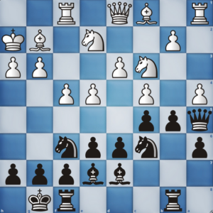 Meine Partie an Brett 7 endete kurz danach. Mir wurde statt der erwarteten ruhigen Eröffnung eine schnell entwickelte weiße Armee inkl. zügigem Hebel im Zentrum serviert. Dankenswerterweise lenkte Hettstedt in einen frühen Damentausch ein, sodass mir nunmehr ausreichend Platz für die restlichen Figuren & bequemes Spiel blieb. Ich nutzte die erstbeste Ungenauigkeit von Weiß aus, um mein Läuferpaar für eine zersplitterte Bauernstruktur zu geben. Um diese Schwäche fokussierte sich mein Spiel fortan. In der nachfolgenden Stellung entschied sich Weiß (am Zug) gegen c5! mit bodenloser Bauernstruktur aber unklarem Spiel für Schwarz.