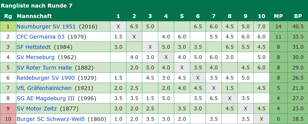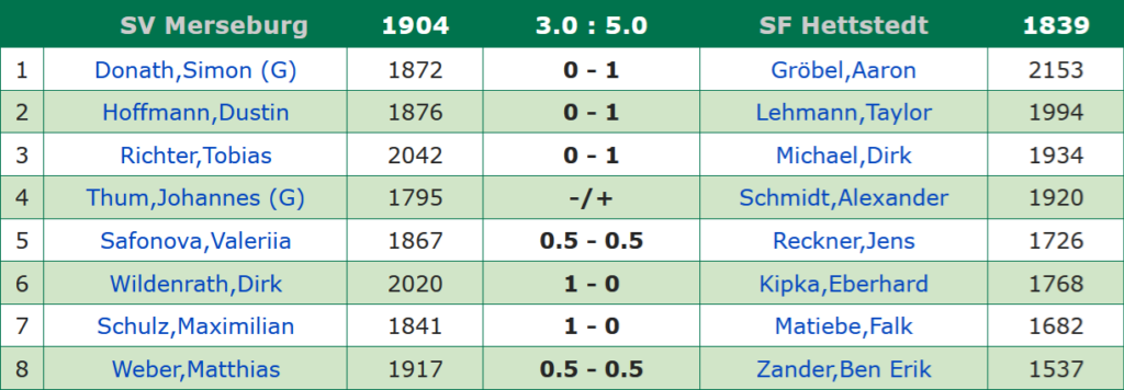 Gegen ein tadelloses Hettstedter Oberhaus kann man in Unterzahl schon mal 2 Mannschaftspunkte abgeben. Mit 8 Spielenden und mehr Schlachtenglück wären auch 4 oder mehr Brettpunkte möglich gewesen. So sollte es diese Saison nicht sein & Hettstedt zog an Merseburg vorbei, was dank der komfortablen Position im Mittelfeld der Liga auch kein Beinbruch ist.
