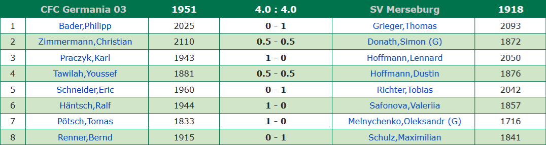 Bei Oleksandr wurden früh diverse Steine getauscht. Es verblieben jeweils ein Paar Türme, Springer & diverse Widerkäuerbesitzer. Der zunächst hohe Druck auf die Köthener Stellung konnte nicht aufrecht erhalten werden, was im scharfen Endspiel zu einem Minus-Traktorfahrer für Merseburg führte. Fortan war Oleksandr um die Punkteteilung bemüht & musste im weiteren Verlauf noch ein paar Farmer tauschen, sodass schlussendlich Turm + Springer + H-Bauer gegen Turm + Springer + G- & H-Bauer mit guten Remis-Chancen verblieben. Hier wurde zu fortgeschrittener Spielzeit dann doch falsch in ein verlorenes Turmendspiel abgebogen (4:4).