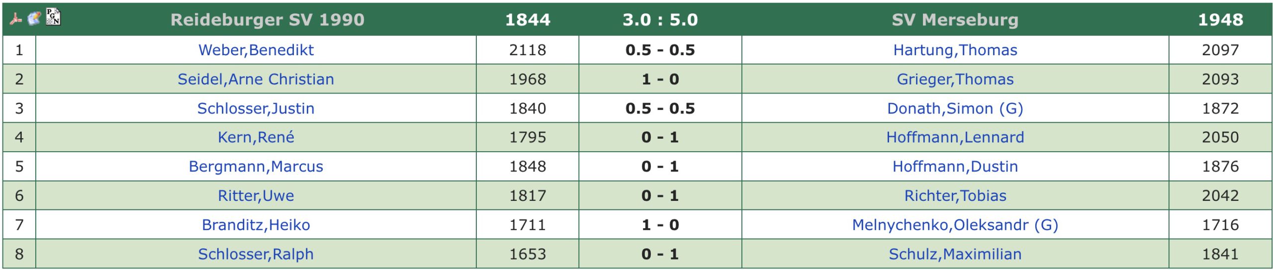Am Ende gewinnen wir verdient mit 5:3. Reideburg gebührt jedoch Respekt – sie lieferten einen starken Kampf und spielten an diesem Tag, gemessen an der reinen Papierform, über ihren theoretischen Erwartungen. In der Tabelle klettern wir damit wieder auf Platz drei. Wohin die Reise am Saisonende geht, wird maßgeblich davon abhängen, wie geschlossen und stark wir in den kommenden Runden antreten können.